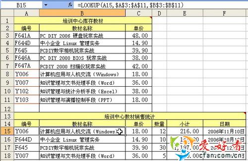 Lookup函数的对比数还可以是文本。在这张图书销售查询表中(见图2),用下表输入的“编号”(A15单元格)文本当作查询数,与上表的“编号”一列($A$3:$A$11)进行对比,查询到了匹配的文本后,将“教材名称”一列($B$3:$B$11)对应的数据提取出来。公式是“=LOOKUP(A15,$A$3:$A$11,$B$3:$B$11)”。