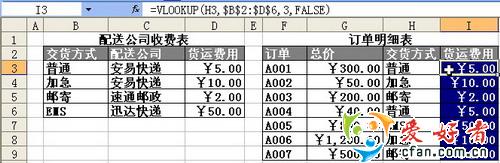 有时候,我们需要精益求精。在下面这个“订单明细表”(见图3)中,最后一列“货运费用”中的数据要通过“交货方式”从左侧“配送公司收费表”中进行匹配查询。这是一个典型的精确查询的例子,计算第1个数据的函数公式是“=VLOOKUP(H3,$B$2:$D$6,3,FALSE)”。