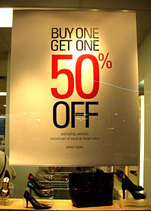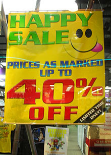 如上:星期八的时候我在关岛的两家商场前分别看到了这两张海报。左边的这张使用了3种颜色(白,红,黑),右边的使用了比它两倍还多即7种颜色(黄,绿,蓝,红,黑,紫,和白)。两例中都对其作为关键元素的数字:40%和50%使用了大字号作为吸引消费者的手段(对“折扣”和“%” 只 使用了小字号,是因为他们处于非重要的地位,并且在商场中顾客很容易推测出这些含义)。而关于折扣的一些限定(诸如打折仅限一定范围的商品,并且必须先全价购买一次才能得到这些鞋上的折扣,等等。)被弱化,以至于忽略,导致消费者经常在准备好进行购买的时候才从店员口中弄清楚折扣的条件。由于在海报的整体设计上主次不够分明,过于花哨,甚至有太多不必要的剪贴画。游戏软件商店的这幅“折扣40%”的海报的宣传效果被大打折扣,并最终被淹没在商场的嘈杂声中。(这不禁让我想起某些幻灯片中使用巨大的标题导致重要内容缩水的例子)。鞋店的这张海报是体现了显著性的一个很好的例子,(“那些显著的差异很好的引起了顾客的关注”)是因为在这张海报中最关键的因素被表现的很清楚。