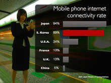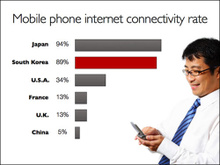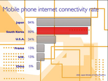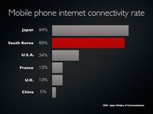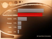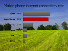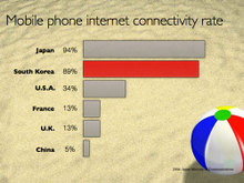 让我们来看看下面的几个例子中,表示2004年手机联网率的图表在幻灯片中的放置有什么不同。本例的主旨是反映在日本和韩国手机联网领域的发展远远超过世界上的其他国家。作为讨论的重点代表韩国的柱形条被强调为红色,其余的条形则无需设置为各不相同的颜色。