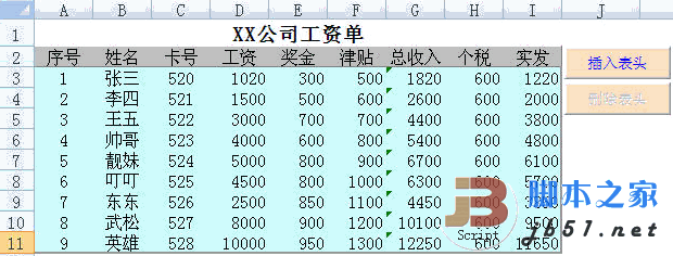操作非常简便,需要生成工资条的时候,只要点插入表头就可以把第一行和第二行作为表头插入到每个人工资数据行的前面,打印完工资单点删除表头就可以去掉表头,恢复到上图的格式,便于存档。宏的代码很简洁,执行效率也很高,推荐使用。