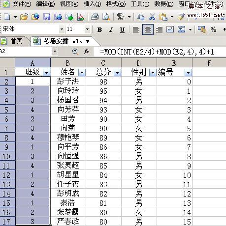在“班级”中,从A2开始,要形成这样的序列:1、2、3、4、2、3、4、1、3、4、1、2、4、1、2、3,如此反复直到最后的学生如图。