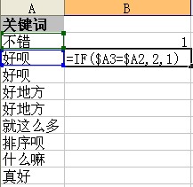 2、然后把旁边一列当辅助列,第一空格打进1,第二空格打入公式:=if($a3=$a2,2,1),然后按下回车键就行(小tips:if函数的中的各个值的意义是这样的=if(逻辑式值,为真时的值,为假时的值),用英语表示可能清楚一点:=if(logic_value,value_if_true,value_if_false)):
