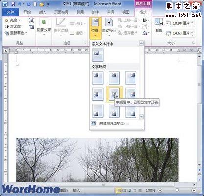 第2步,在打开的“图片工具”功能区的“格式”选项卡中,单击“排列”分组中的“位置”按钮,则在打开的预设位置列表中选择合适的文字环绕方式。这些文字环绕方式包括“顶端居左,四周型文字环绕”、“顶端居中,四周型文字环绕”、“中间居左,四周型文字环绕”、“中间居中,周型文字环绕”、“中间居右,四周型文字环绕”、“底端居左,四周型文字环绕”、“底端居中,四周型文字环绕”、“底端居右,四周型文字环绕”九种方式,如图2010061005所示。