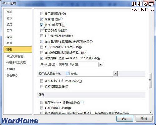 第2步,在打开的“Word选项”对话框中切换到“高级”选项卡,然后在“打印”区域选中“逆序打印页面”复选框,并单击“确定”按钮,如图2010072202所示。