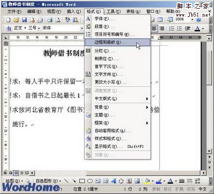 第1步,打开Word2003文档窗口,将插入点光标定位到文章标题所在的段落中。在菜单栏依次单击“格式”→“边框和底纹”命令,如图2010072206所示。
