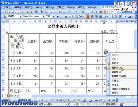 第3步,如果Word表格中的来访次数改变以后,可以通过“更新域”来重新汇总计算。用鼠标右键单击汇总结果,执行“更新域”快捷命令,即刻就能得到更新后的汇总结果,如图2008071254所示。