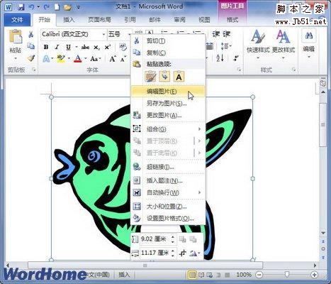 第1步,打开Word2010文档窗口,右键单击准备修改颜色的剪贴画,并在打开的快捷菜单中选择“编辑图片”命令,如图2010111101所示。