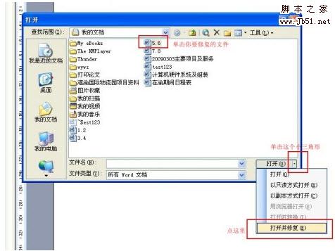 第二步:点击word软件左上角的 文件-打开,找到你损坏掉了的那个文件的路径,比方说我要恢复的是5.6.doc这个文件,那么用鼠标点击一下它,注意,是点击一下,不是双击。