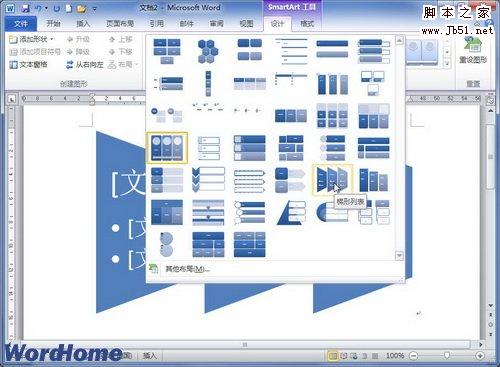 第1步,打开Word2010文档窗口,单击SmartArt图形。在“SmartArt工具/设计”功能区中单击“布局”分组中“其他”按钮,在打开的布局列表中根据需要重新选择SmartArt布局即可,如图2011070101所示。