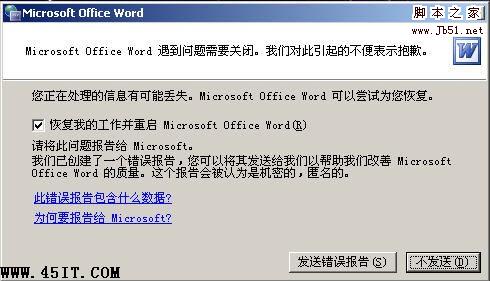 word打不开,显示上面的对话框,在点击了“不发送”按钮后将关闭。再次运行 Word,将询问是否以安全模式启动 Word。在此如果选择“是”,Word 将进入“安全模式”。在这种模式下,Word将仅显示空白窗口,需要再手动打开文档方可显示。如果选择“否”,则Word又将弹出错对话框,陷入死循环。