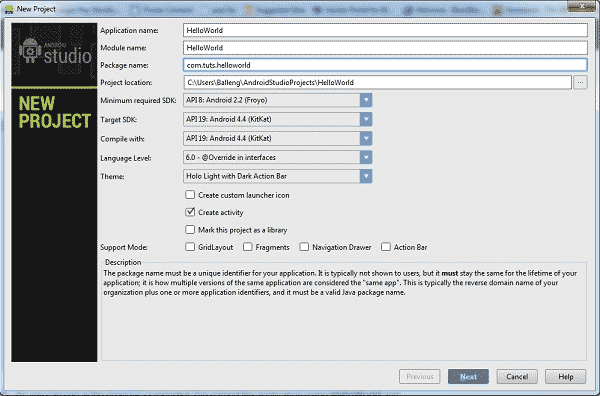 由于我们需要从零开始,因此这里选择“新项目”。这时大家会看到一份选项列表,旨在对我们的新项目作出配置。在今天的教程中,我们将创建一款简单的应用程序,主要目的是为大家演示Android Studio中最为重要的一部分功能特性。相信大家也和我一样,会认为“HelloWorld”这个名称最适合本次开发出的新项目。