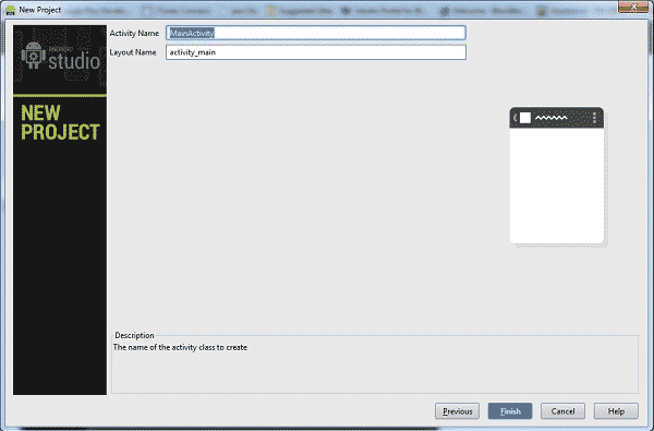 由于我们在之前的步骤中勾选了“Create activity(创建activity)”项目的勾选框,因此这里导航会要求大家对Android Studio将为我们创建的Activity类进行配置。