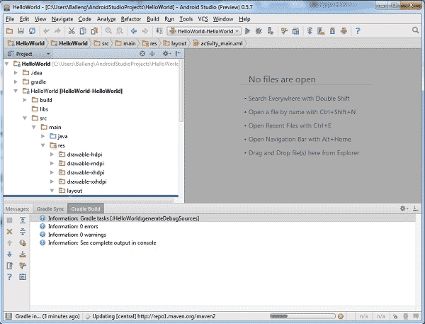 在点击“Finish”之后,大家会看到如下图所示的Android Studio用户界面。其中窗口左侧为项目资源管理器,右侧则为工作区。在Android Studio中对项目进行设置之后,现在我们可以逐一查看Android Studio当中的各项关键功能。