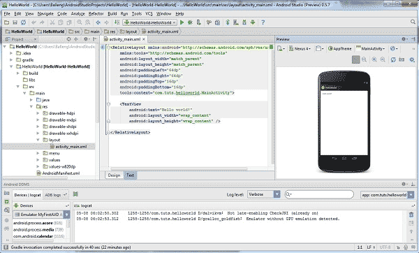 既然Android模拟器已经成功启动并开始运行,现在是时候启动我们的应用程序了。在“Run”菜单中选择“Run ‘helloworld’”——没错,在Android模拟器中运行应用程序就是这么简单。