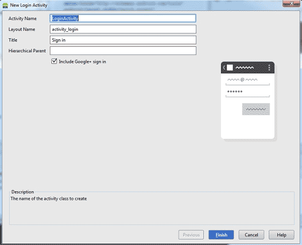 如大家在上面的截图中所见,我已经将新建的Activity命名为LoginActivity——也就是为activity login设定Layout Name——并为该Activity添加了一个名为Sign In的标题。在默认情况下,对话框中的Include Google+ sign in项目已经被勾选。由于我们不打算在今天的示例中使用Google+登录功能,因此取消该勾选项。