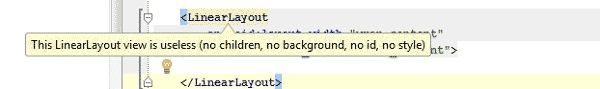 就以下面这幅截图为例,大家可以看到该布局中的LinearLayout并未得到实际使用。Android Lint的优势在于,它能帮助我们重视警告或报错信息的出现原因,从而更轻松地修复或者解决这些问题。