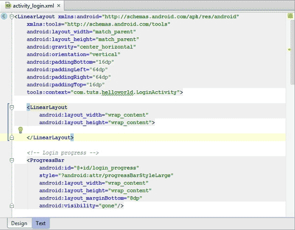 要使用实时布局,我们需要双击对应XML布局文件并选择工作区下方的“Text”标签。接下来选择工作区右侧的“Preview”标签来预览当前布局。我们对XML布局作出的任何变更都会直接反映在右侧的预览窗口当中。大家可以查看下面这幅截图来深入理解这项功能。