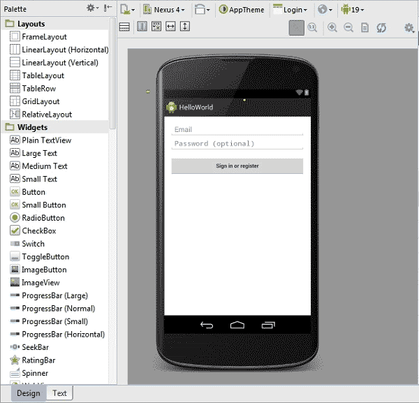 点击Design标签则会激活另一套编辑器内容,其中显示出布局的预览效果。要向布局当中添加其它功能性组件,我们只需将其从布局左侧的组件列表中拖出并放入布局内即可。是的,就这么简单。