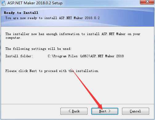3、选择安装位置,程序默认安装在“C:\Program Files (x86)\ASP.NET Maker 2018”,这里默认即可,点击“Next"