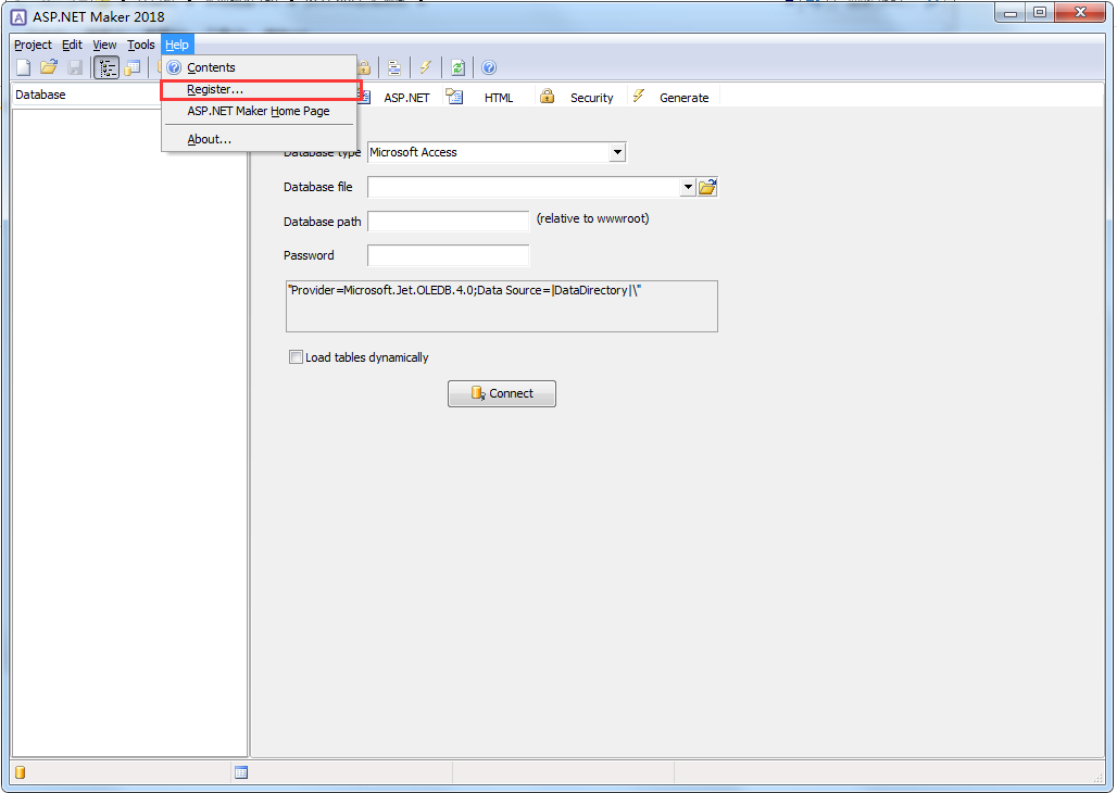 5、打开ASP.NET Maker 2018软件,找到“Help——Register”进行注册
