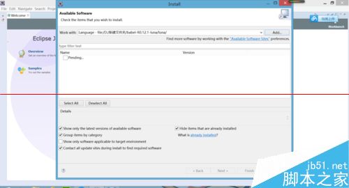 第三步:打开eclipse,找到help打开,如图打开红色部分,按照步骤操作,name:你可以任意取,location的话有两种方法:一种是找到语言包Luna的位置,还有一种是把语言包下载的位置复制过来