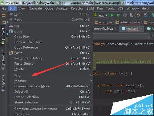 2、光标选中完成之后,进行点击Android studio中的菜单中的“Edit”的选项。