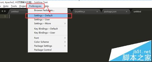 1、首先打开系统默认的配置内容,点击菜单:“Preferences”->“Settings - Default”
