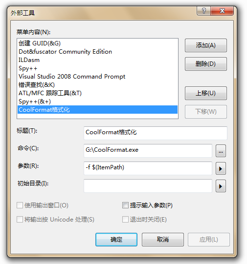 支持命令行使用,直接传入“-f 文件名”,可自动根据文件的后缀名进行相对应语言的格式化。另外还可以当做VS的外部工具,进行调用。