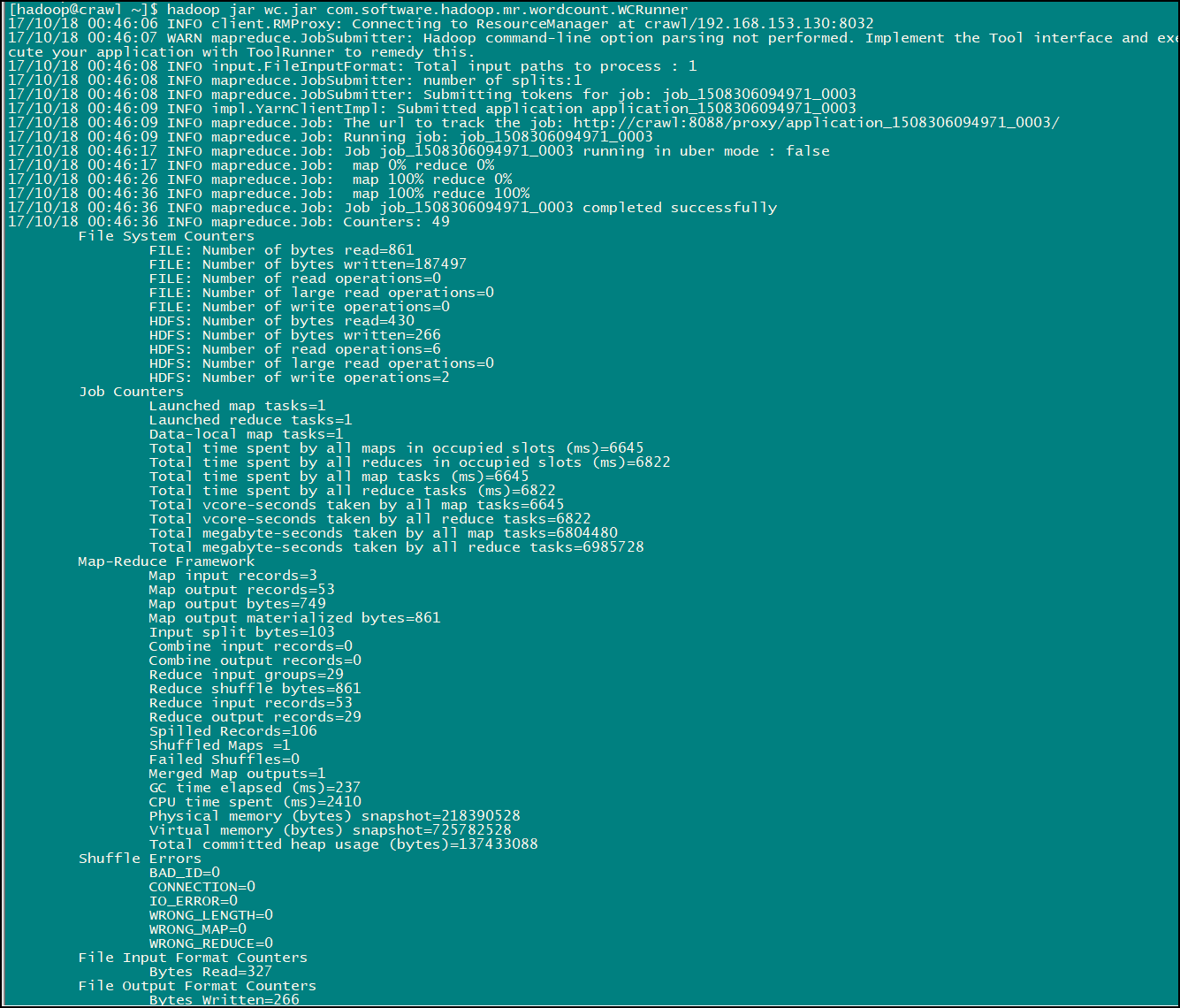 命令:hadoop jar wc.jar com.software.hadoop.mr.wordcount.WCRunner