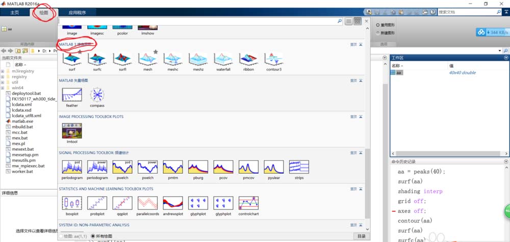 2、在Matlab左上角,打开“绘图”——“MATLAB三维曲面图”,自行选择图形类型。这里我们选择最常用的第一个类型命令为“surf”,生成如下图形。