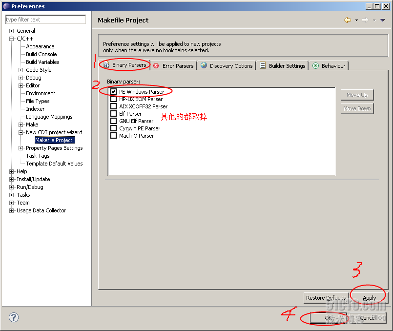 打开eclipse,进入Windows>Preferences>New CDT project wizard>Makefile Project