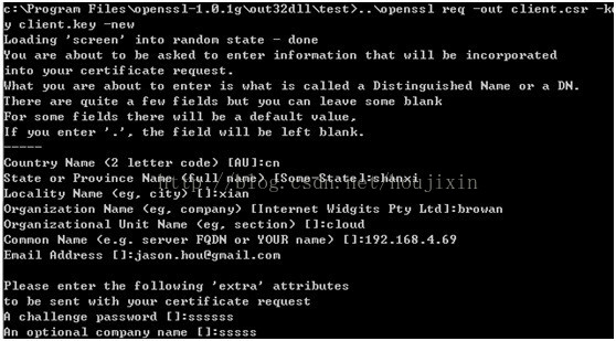 3) 生成证书请求文件:..\openssl req -out server.csr -key server.key -new