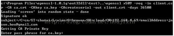 4) 生成证书文件:..\ openssl x509 -req -in client.csr -CA ca.crt -CAkey ca.key -CAcreateserial -out client.crt -days 36500