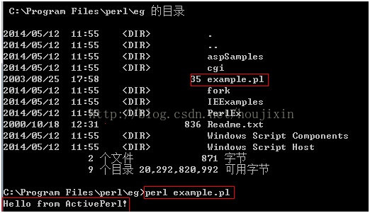 进入perl安装目录的eg文件夹,执行“perl example.pl”若显示“Hello from ActivePerl!”,则说明Perl安装成功。如下图所示: