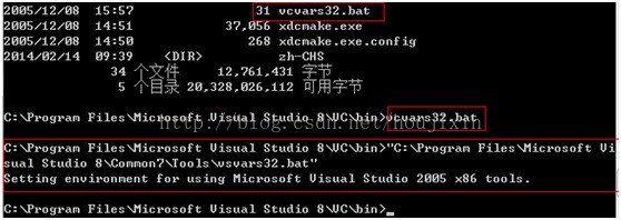 执行VS2005的bin目录下(例如:C:\Program Files\Microsoft Visual Studio 8\VC\bin)的vcvars32.bat文件即可完成配置,如下图所示:
