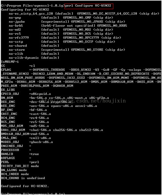 (2)通过命令窗口,进入openssl的目录C:\Program Files\openssl-1.0.1g中,执行“perl Configure VC-WIN32”即可完成配置,如下图所示: