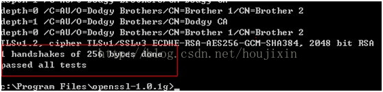 在openssl目录下执行命令“nmake -f ms\ntdll.mak test”即可完成测试,如下图所示