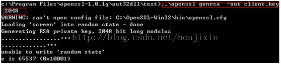 2)执行命令生成证书的key文件:..\openssl genrsa -out client.key 2048,如下图所示: