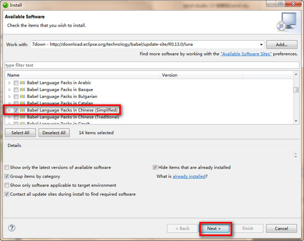 如果不想在线汉化,可以直接下载汉化包,先解压下载下来的汉化包,然后选择Help菜单 ->Install New Software...在弹出的窗口中点击"add..."按钮,在弹出的窗口中点击"Local..."按钮,在弹出的窗口中选择你解压出来的汉化包的 juno文件夹,点"ok"按钮,最后选择“Babel Language Packs in Chinese(Simplified)”简体中文选择项,一路Next下去就可以了。