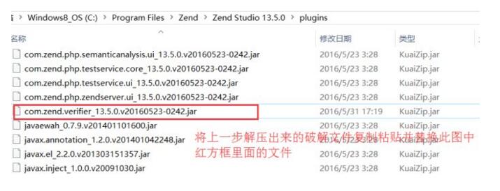 将com.zend.verifier_13.0.0.v20150925-1108.jar文件替换到Zend Studio软件安装程序 C:Program Files (x86)\Zend\Zend Studio 13.5.0\plugins文件目录下,如图: