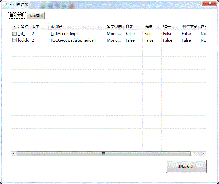 在第一个Tab页,你可以看到当前数据集的所有索引一览。你可以选择索引,然后将其删除。