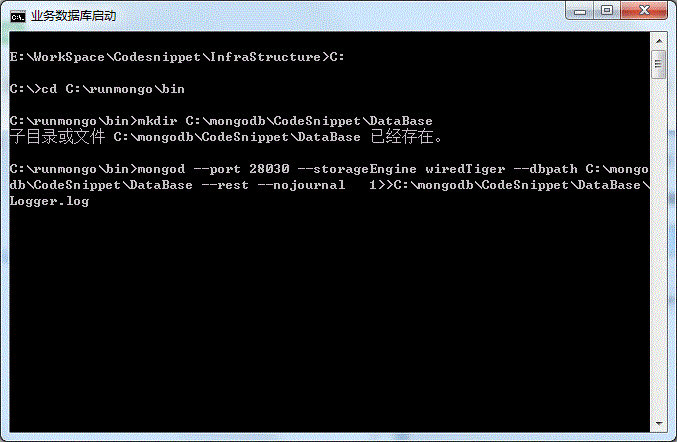 C: cd C:\runmongo\bin mkdir C:\mongodb\CodeSnippet\DataBase mongod --port 28030 --storageEngine wiredTiger --dbpath C:\mongodb\CodeSnippet\DataBase --rest --nojournal >> C:\mongodb\CodeSnippet\DataBase\Logger.log