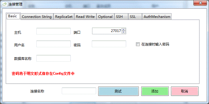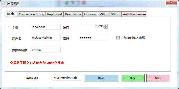 注意:如果你使用了用户,密码将使用明文保存在配置文件中。当然,你也可以选择在连接时输入密码的选项,这样密码不会被保存在任何地方,在系统进行连接的时候才要求您输入密码。