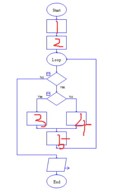 2、在Start 和 end之间依次添加 赋值 赋值 循环 选择 赋值 赋值 赋值 赋值 输出 符号添加完后如下图所示