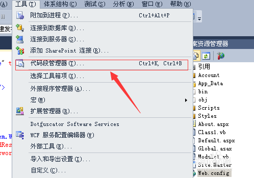 3、进行点击工具的菜单中之后,弹出了下拉菜单选中为“代码段管理器”选项。