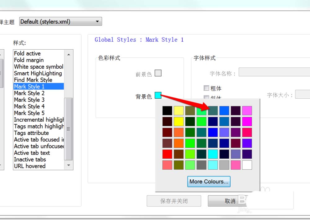 5、单击下图中的颜色块,可以更改默认样式的颜色,如下我们给【Mark Style1】换了一种颜色方案,则给选中文本设置【使用样式1】时就会变成我们更改后的颜色了。