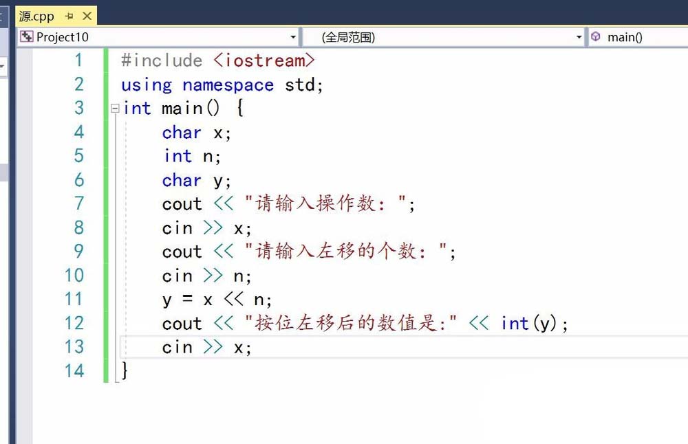10、将获取的操作数进行按位左移运算,这里使用 << 表示按位与运算符号。最后将结果输出。