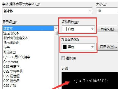 “项前景色”即代码的颜色,我们将其设置为白色,“项背景色”即背景颜色,我们将其设为黑色。设置好后,我们可以看到预期效果,如果满意的话,点击“确定”进行保存。