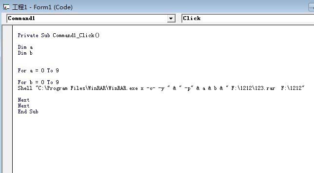 Private Sub Command1_Click() Dim a Dim b For a = 0 To 9 For b = 0 To 9 Shell "C:\Program Files\WinRAR\WinRAR.exe x -o- -y " & " -p" & a & b & " F:\1212\123.rar F:\1212" Next Next End Sub
